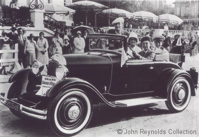 | Left: Bernard Citroën (at the wheel) with his brother and sister and Maurice Chevalier, in their C4 Cabriolet at Deauville, September 1930. | |