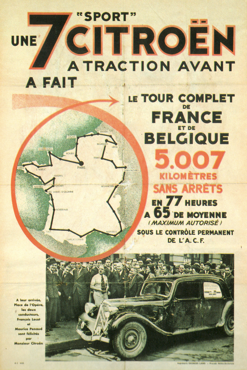 Below in 1934, the year before his monumental feat described above, François Lecot with co-driver Maurice Penoud covered 5007 km in 77 hours at an average speed of 65 km/h in a 7CV. The trip circumnavigated France and Belgium.