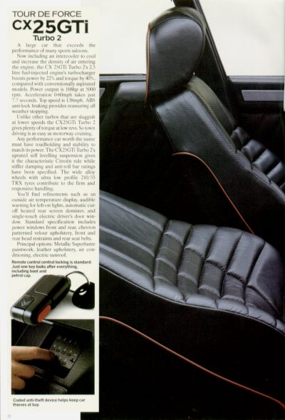 Now including an intercooler to cool and increase the density of air entering the engine, the CX 25GTi Turbo 2's 2.5 litre fuel-injected engine's turbocharger boosts power by 22% and torque by 40%, compared with conventionally aspirated models. Power output is 168hp at 5000 rpm. Acceleration 0-60mph takes just 7.7 seconds. Top speed is 138 mph. ABS anti-lock braking provides reassuring all weather stopping.