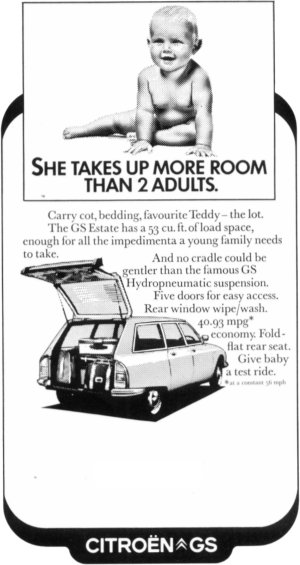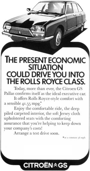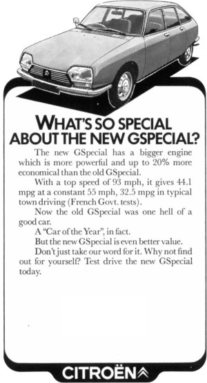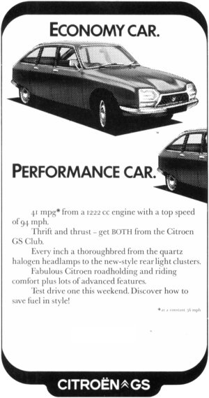 British GS Dealer AdvertisementsIn 1977, Citroën ran a series of small adverts in magazines and newspapers for dealers - the blank space in each one is for the insertion of dealer name and address. |